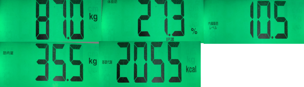 体重86.6㎏、体脂肪率25.7%、内臓脂肪レベル10.0