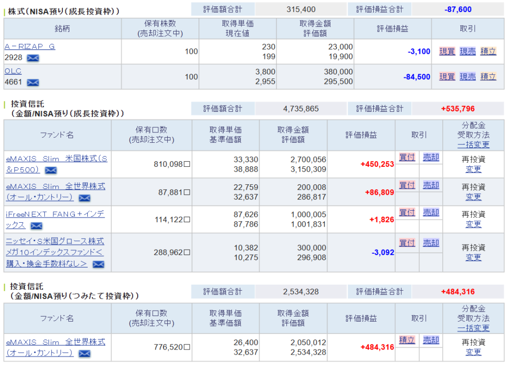 毎月10万円積みたてしている、つみたて投資枠での185万円分は前回よりも27,031円黒字となり、484,316円の黒字となりました。利率は+23.63%(前回+23.45%)となっています。