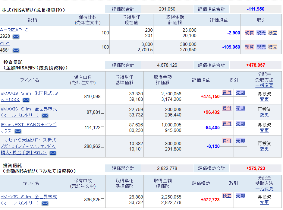 オルカンの二つをトータルすると669,155円の利益で、利率+27.31%(前回+27.07%)という結果になっています。さらに他の投資信託を混ぜると1,050,780円の利益で利率+16.29%(前回+17.39%)となりました。前回よりも減ってしまいました。