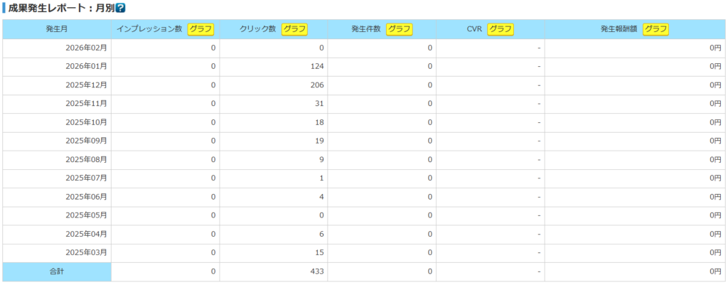ただ、12月同様に3桁のクリックはあり自分の中ではかなりみられているのかなと思うのですが、やはりそこは特化ではないからか成果につながりませんね。