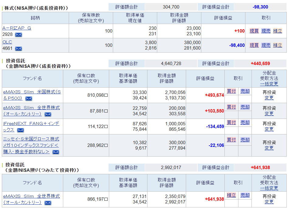 個別株は38万円+2.3万円で購入し前回に比べて13,650円上がり、98,300円の損失です。久しぶりにRIZAPの株がプラスになっていました。