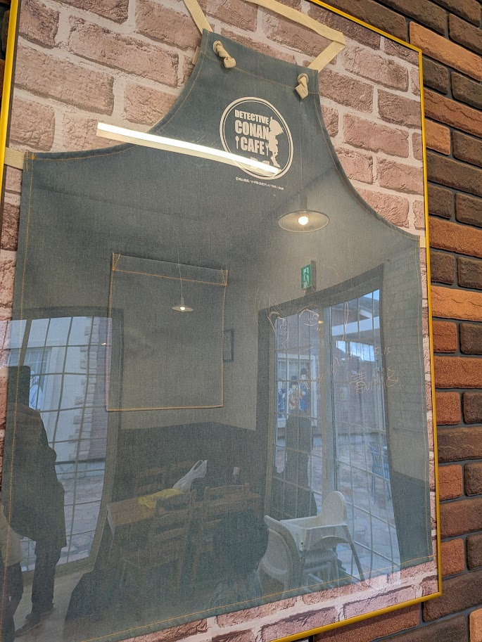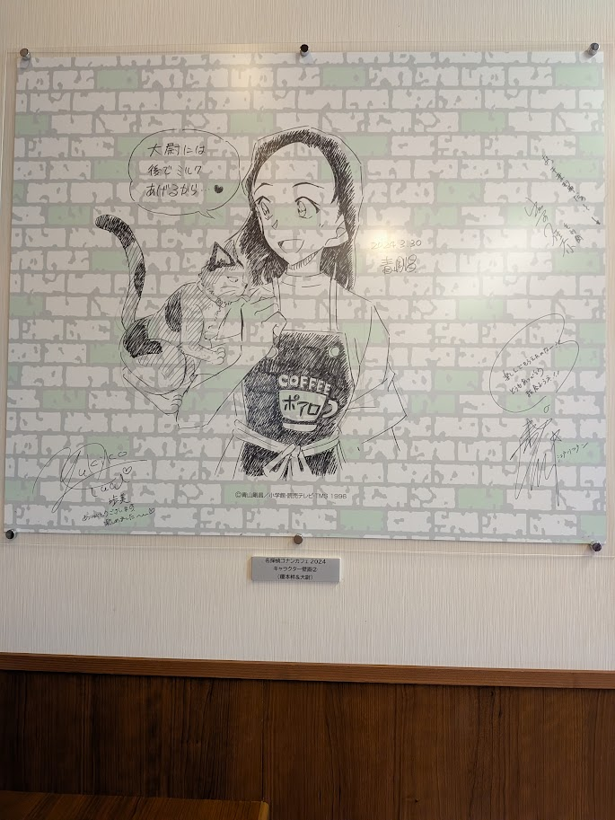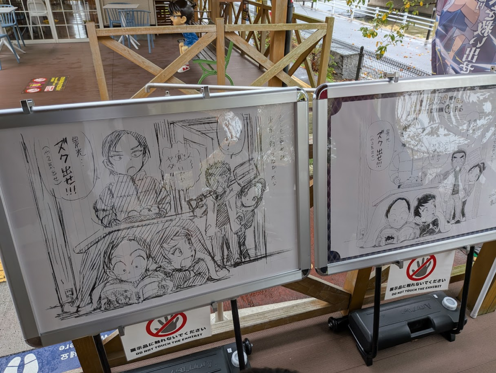 お土産屋さんの近くにのベンチではコナンがいたり、書下ろしイラストが原画とともにおいてあったりしましたよ。
