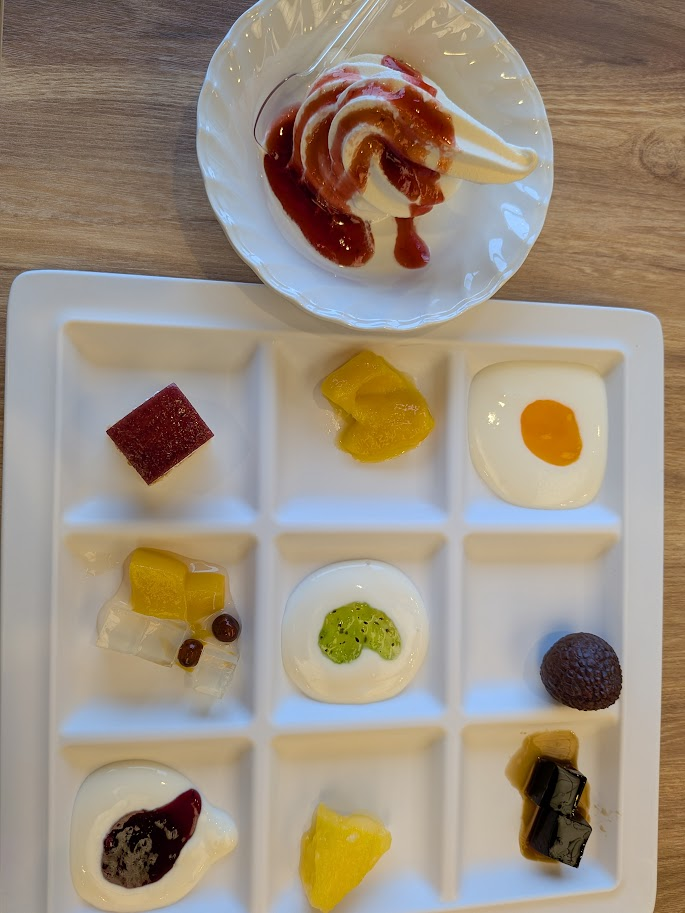 デザートの種類はそんななかったので、9か所埋めるためにヨーグルトを3種類盛ってみました。