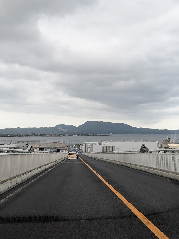 理由は、中海が汽水湖(海水と淡水がまじりあった湖)でその真ん中を突っ切ることができるから。そして、江島大橋が見た目結構な坂であり興味があったためです。ちなみにその橋の最上部は高さ45mらしいですよ。