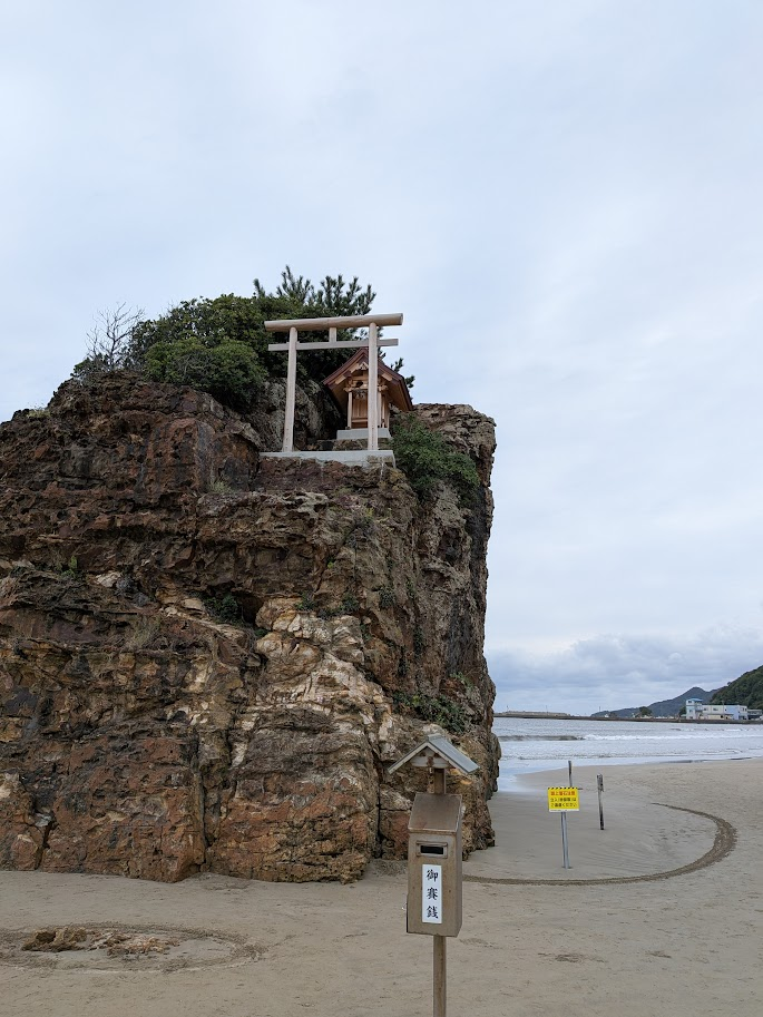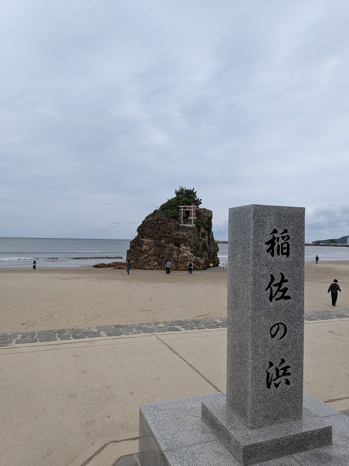 稲佐の浜につくと石碑があり、その奥の海岸に弁天島の鳥居をみることができます。