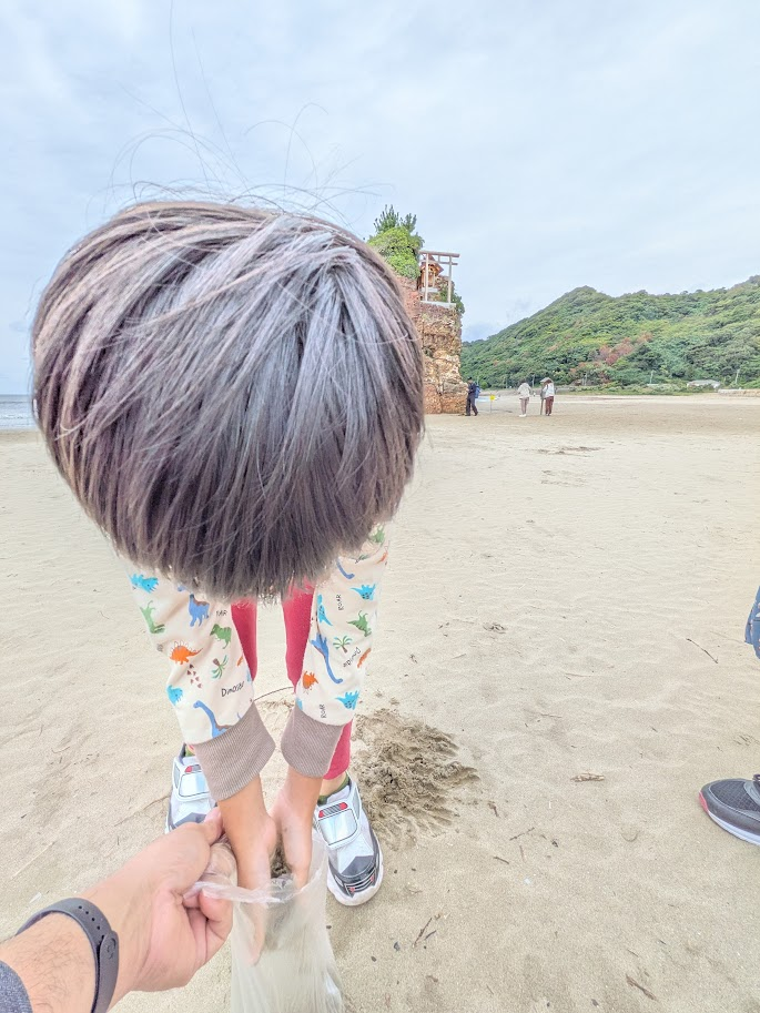 ここらの砂を袋に入れて出雲大社にもっていきます。