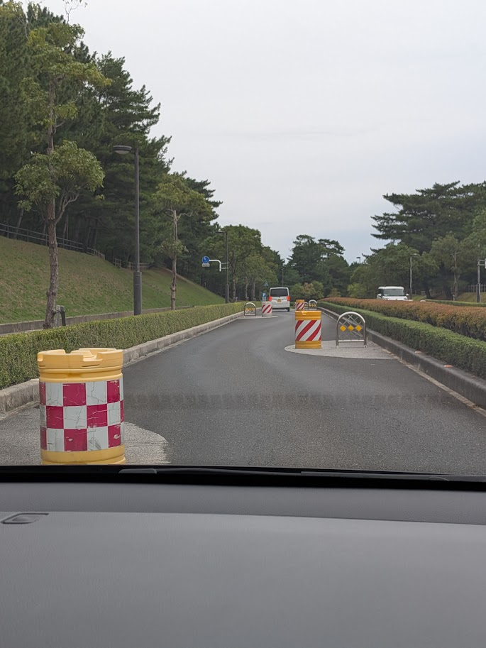 さらに出雲市駅方面へとすすめると総合公園的なところに。そしてその間を通る道がこんな感じ(後ろがいないことを確認して停車して撮影をしています)。スピードを出させないためなんでしょうか、ジグザク運転を余儀なくされますが、これって逆にスピード出してタイムアタックするやついそう。