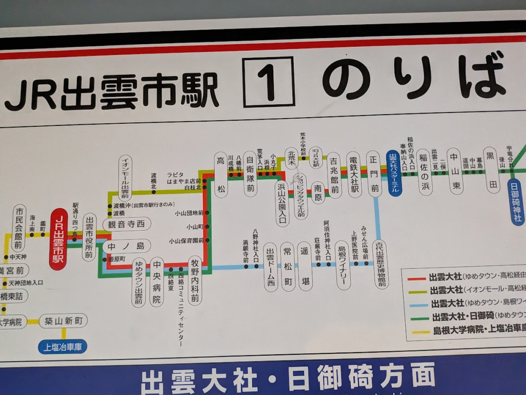 出雲市駅(写真の赤い部分)から出雲大社の正門前(写真の真ん中やや右の青い部分の左)までは4つの路線があり結構頻回にバスが出ています。