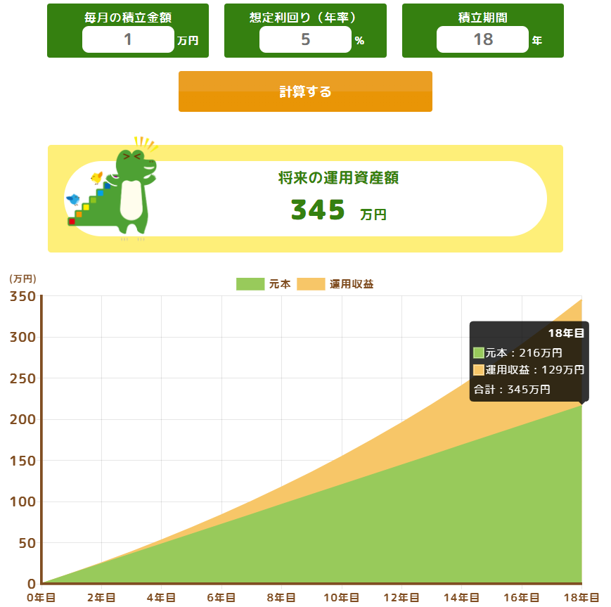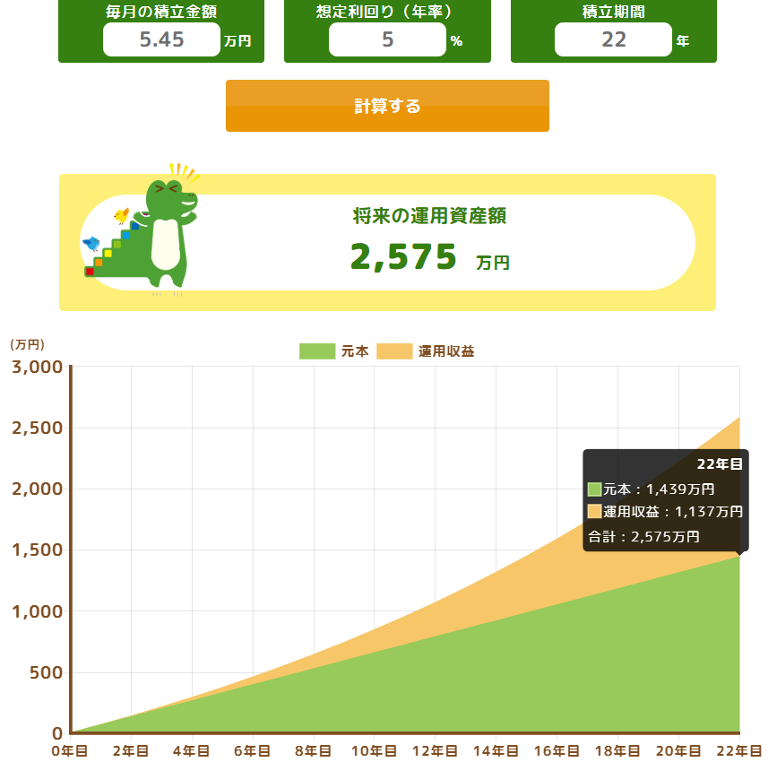 ちなみに、「元本がそもそも違うんだから当たり前だ」という声がきこえてきそうなので、月々の積立額を5.45万円として18歳から40歳まで積み立てると右のようになります。