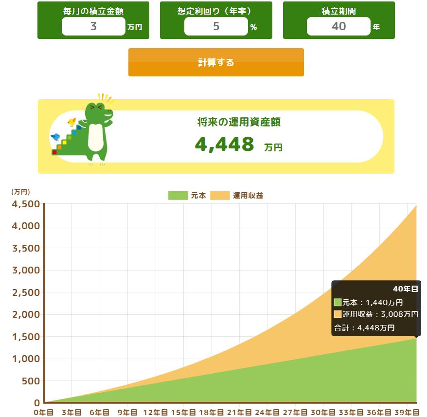 左が0歳~40歳まで積み上げた場合になりますが、元本1440万円に対して運用収益が3008万円となり、合計4448万円になります。