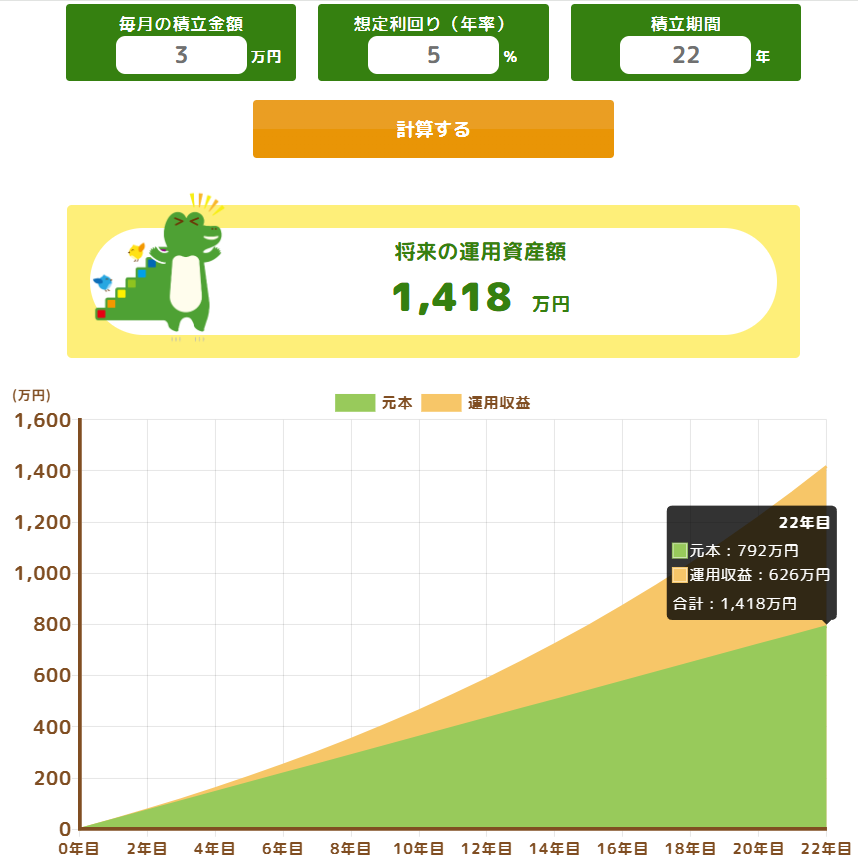 右が18歳~40歳まで積み上げた場合で、元本792万円に対して運用収益626万円で、合計1418万円になります。