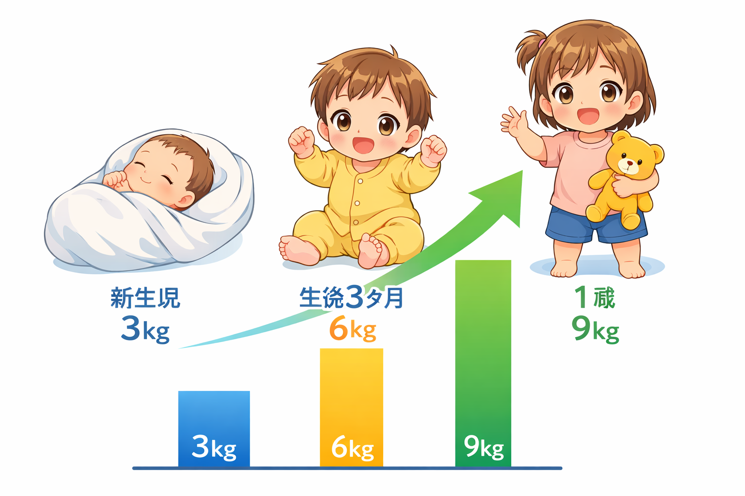 ただし、3か月目以降は緩やかになり、1歳で体重が3倍程度(約9㎏)になるのが目標になります。