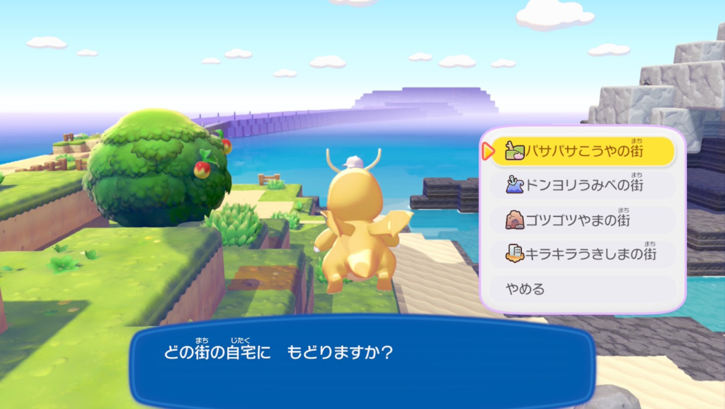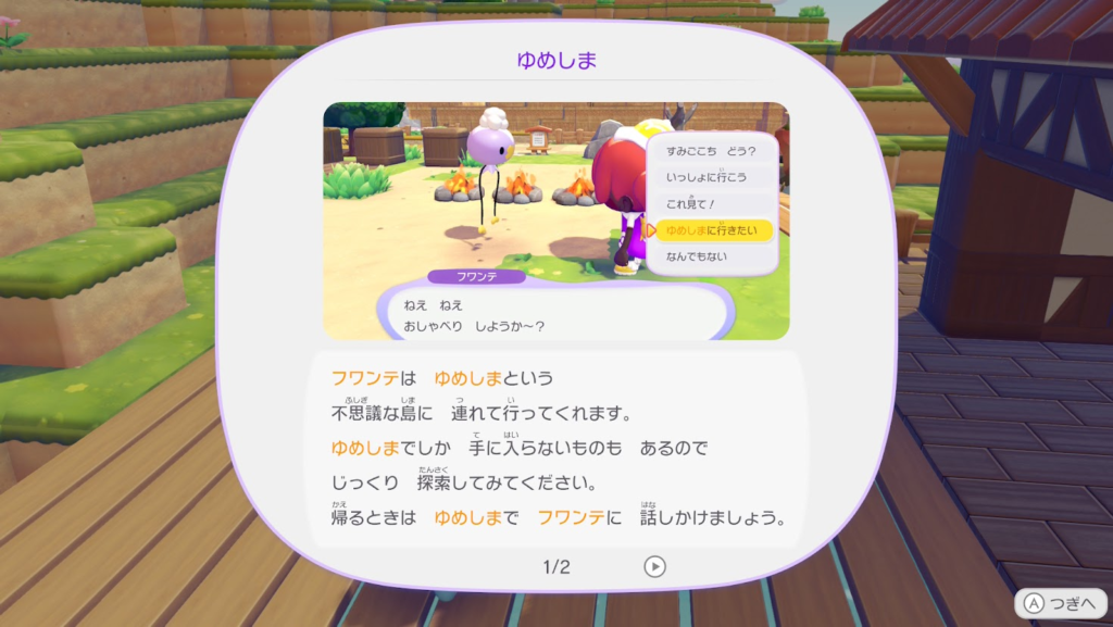 ただ、ストーリーとは関係なく、他のプレーヤーと共同作業ができるエリアや、フワンテを友達にしてからいける「ゆめしま」というエリアがあります。「ゆめしま」はある条件で複数の散策先を選べるようになるので、それらを併せると10個近くになるのかな?