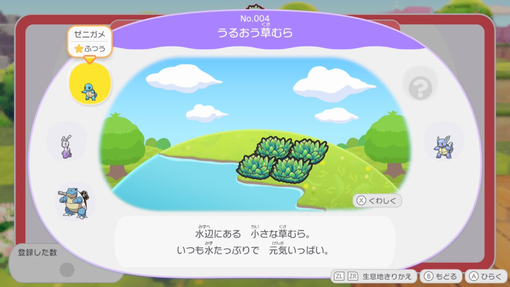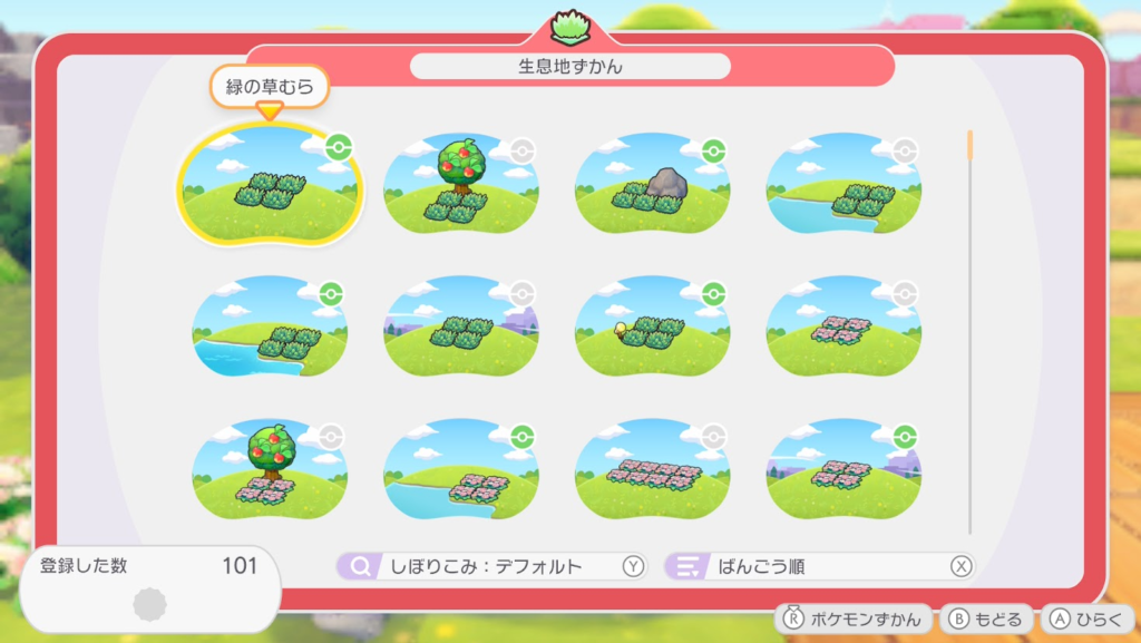 ちなみに生息地一覧で、生息地の右上のモンスターボールが緑色になっているところはその生息地で友達になれるポケモンが出尽くしたというサインになります。逆に灰色のものは、まだ出会えていないポケモンがいるというもの。