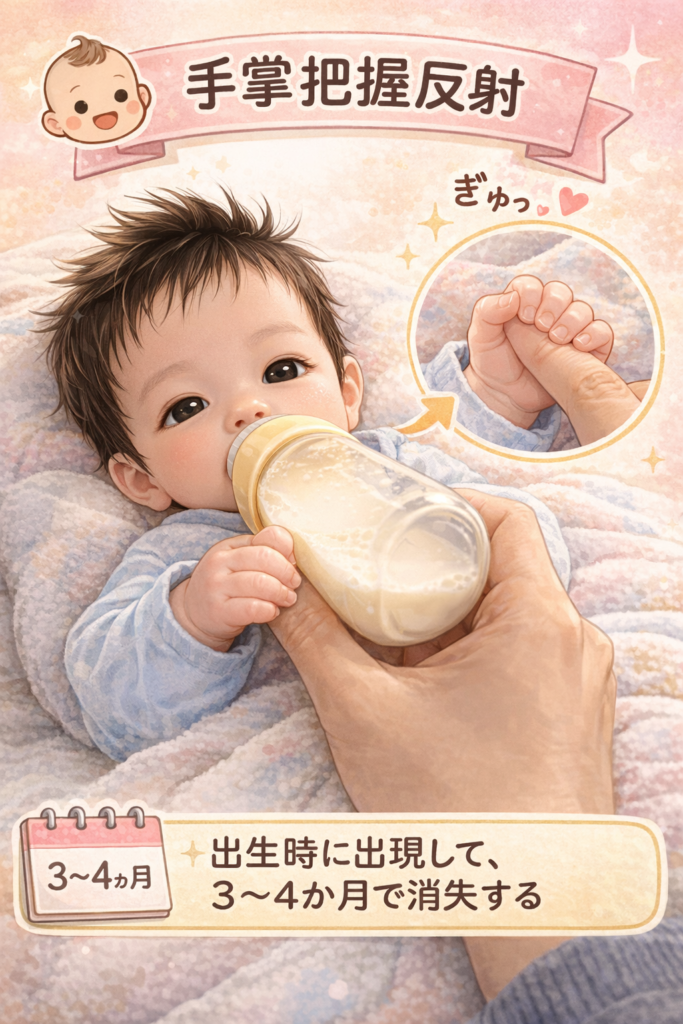 | 原始反射 | 手掌把握反射 | 出生時 | 3〜4か月 | 手に触れると握る | 長く残る →発達評価 |