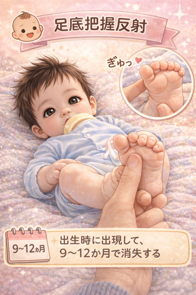 足底前方への刺激により足趾が屈曲する反射で、立位や歩行に向けた足部機能の基礎となります。一般的に生後9〜12か月頃に消失します。反応の減弱や左右差は、足部機能や神経発達の評価対象となることがあります。