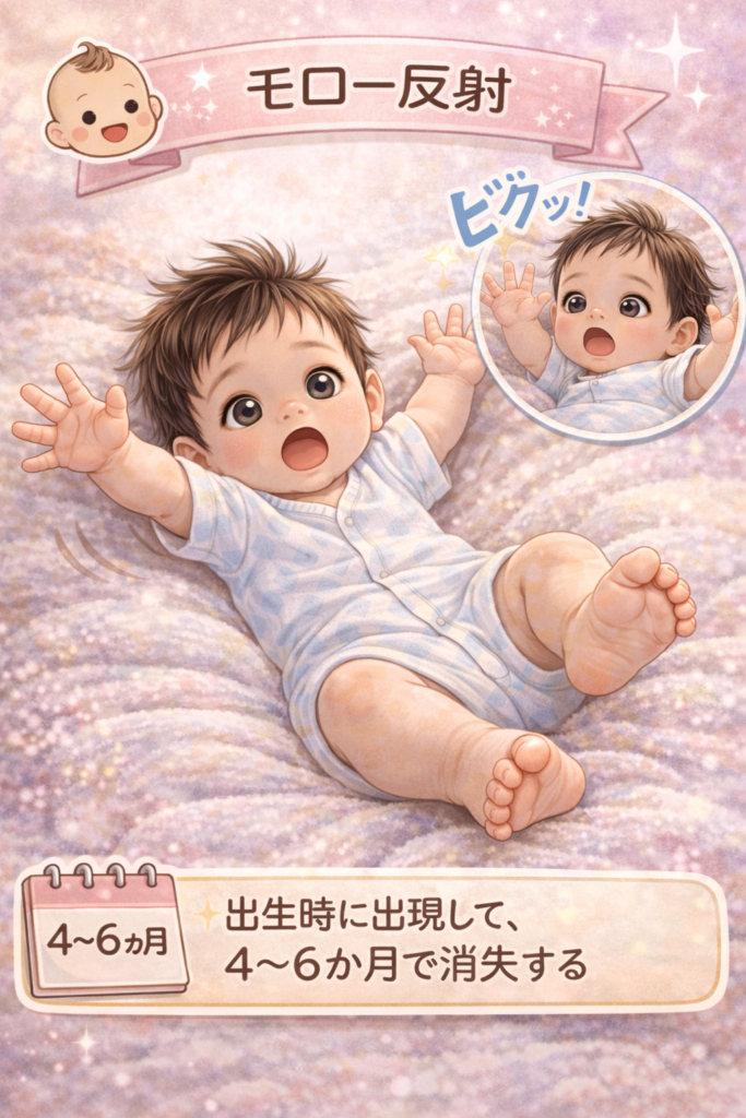 急激な姿勢変化や音刺激に対して、上肢を外転・伸展し、その後内転・屈曲する反応です。原始的な防御反応と考えられます。生後4〜6か月頃に消失するのが一般的で、左右差や過剰・減弱は神経学的評価の指標となります。