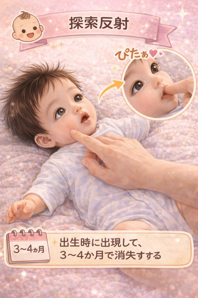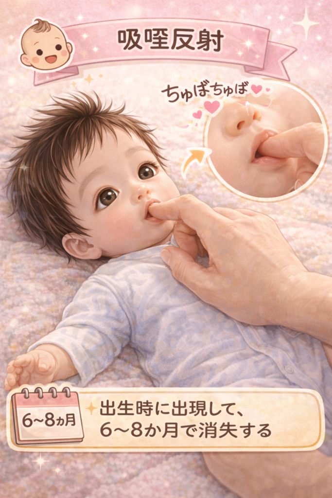 口腔内または口唇への刺激に対して吸啜運動が誘発される反射で、栄養摂取に不可欠です。生後3〜4か月頃に随意運動へ移行します。反応の低下は哺乳不良や体重増加不良に関連することがあります。