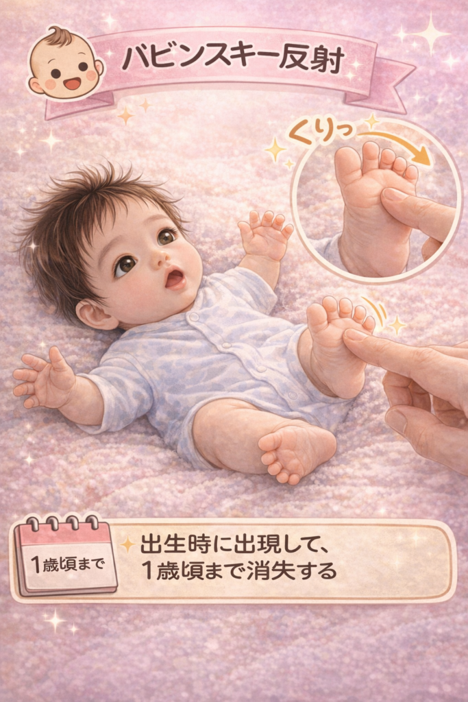 足底外側を刺激すると母趾が背屈し、他の足趾が開扇する反応です。乳児期には正常所見ですが、錐体路の未熟性を反映しています。一般的に1〜2歳頃までに消失し、それ以降の持続は中枢神経系の評価対象となります。