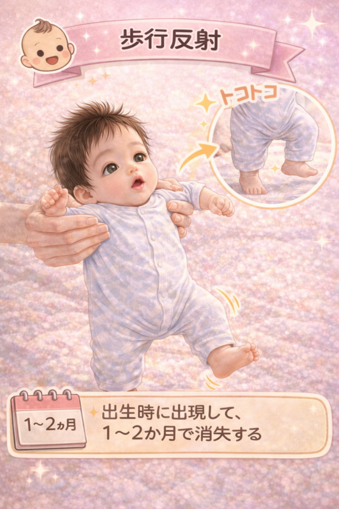 立位様姿勢で足底を接地させると、交互に下肢を動かす反応です。歩行様運動の原型とされます。通常は生後1〜2か月頃に消失し、持続する場合は神経発達の評価が必要となることがあります。