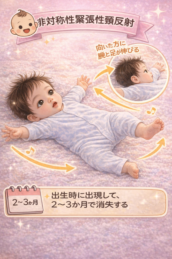 | 原始反射 | 非対称性緊張性頸反射 | 出生時 | 4〜6か月 | 顔側が伸び反対が曲がる | 強い/持続 →運動発達に影響 |
