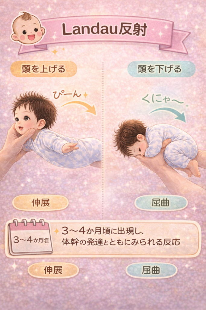 | 姿勢反射 | Landau反射 | 3〜4か月 | 1歳半〜2歳 | 体を持ち上げると伸展 | 出現しない →体幹発達注意 |