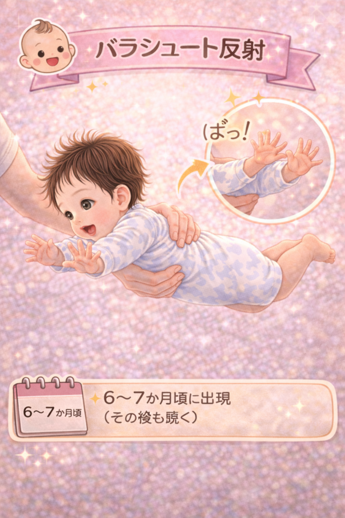 | 姿勢反射 | パラシュート反射 | 6〜7か月 | 消失しない | 手を出して支える | 出ない →転倒リスク |