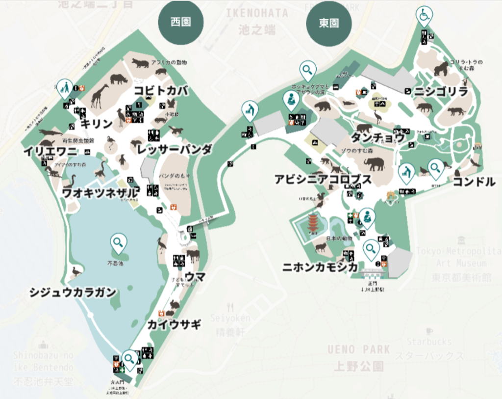 上のマップは上野動物園のHPから引用をさせていただきました。御覧のように、東園と西園の2つにわかれており、間を普通の道路が通っています。