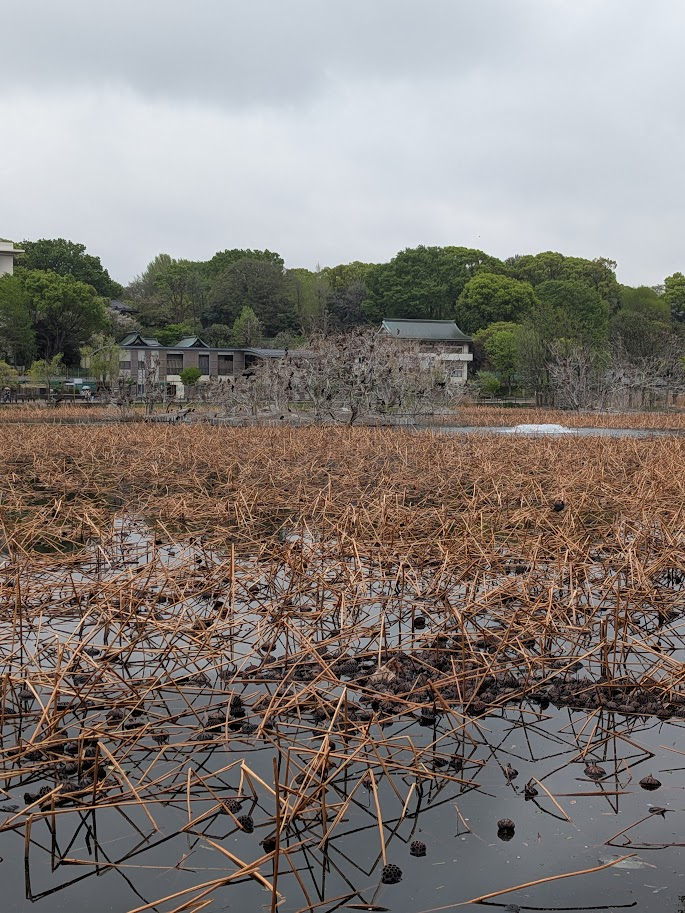 なぜかこどもが一番見たがっていたアイアイの森を目指すことに。途中ペンギンの展示や不忍池を渡るところがあるのですが、不忍池が春らしからぬ姿というか、晩秋の感じがすごくしました。ちなみに行ったのは4月2週目です。