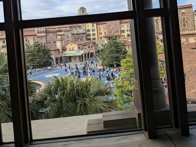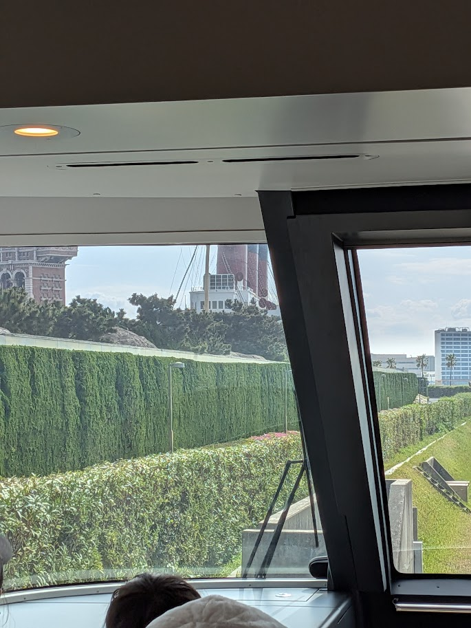 ちなみに、電車は一方通行なので半時計周りにしか回りません。なので、進行方向左側に立っていると窓の外にはディズニーの景色が広がりますよ!まぁ、写真はちょっとあれですけど・・・。