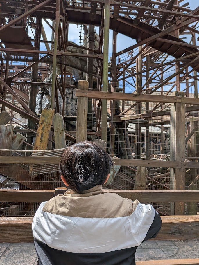 天気もよく絶好のレイジングスピリッツ日和。しかし、ここで異変が。まじまじとアトラクションを見る息子。